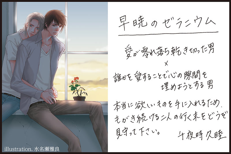 12月6日に『早暁のゼラニウム』が発売となります。千夜時先生のデビュー作となりますが、今の率直なお気持ちをお聞かせください。
